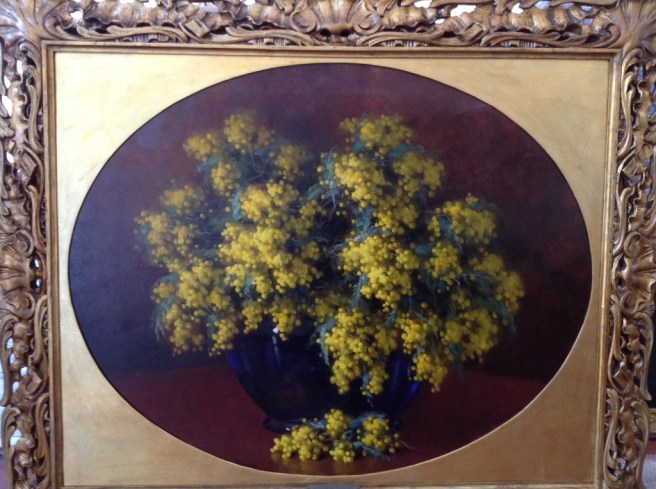 Importante e splendidamente incorniciata natura morta di mimose del pittore Alfio Paolo Graziani( Roncoferraro, 1900-Gavirate, 1981)