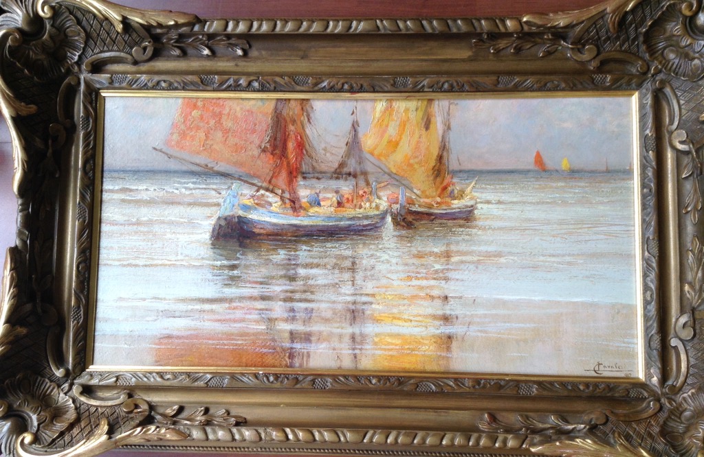 Ludovico Cavaleri( Milano, 1861-Cuvio, 1942), affascinante marina giocata su splendidi contrasti di colore e giochi di luce che si riflettono sull’acqua.