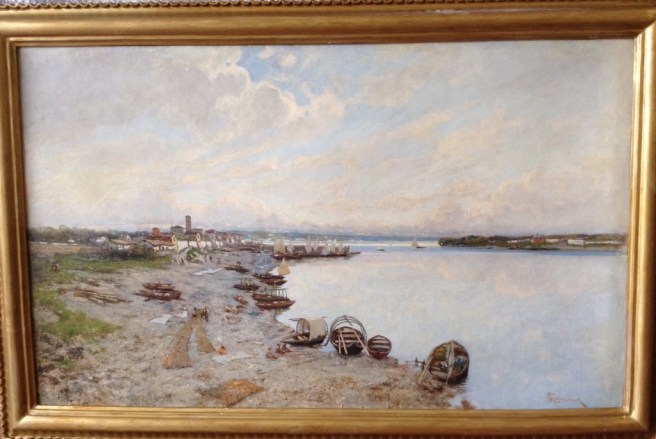 Luminosissima ed animata veduta di Sesto Calende, pregevole grande opera ad olio su tela incollata su cartone rigido del pittore modenese Lorenzo Gignous( Modena, 1862-Porto Ceresio 1958)