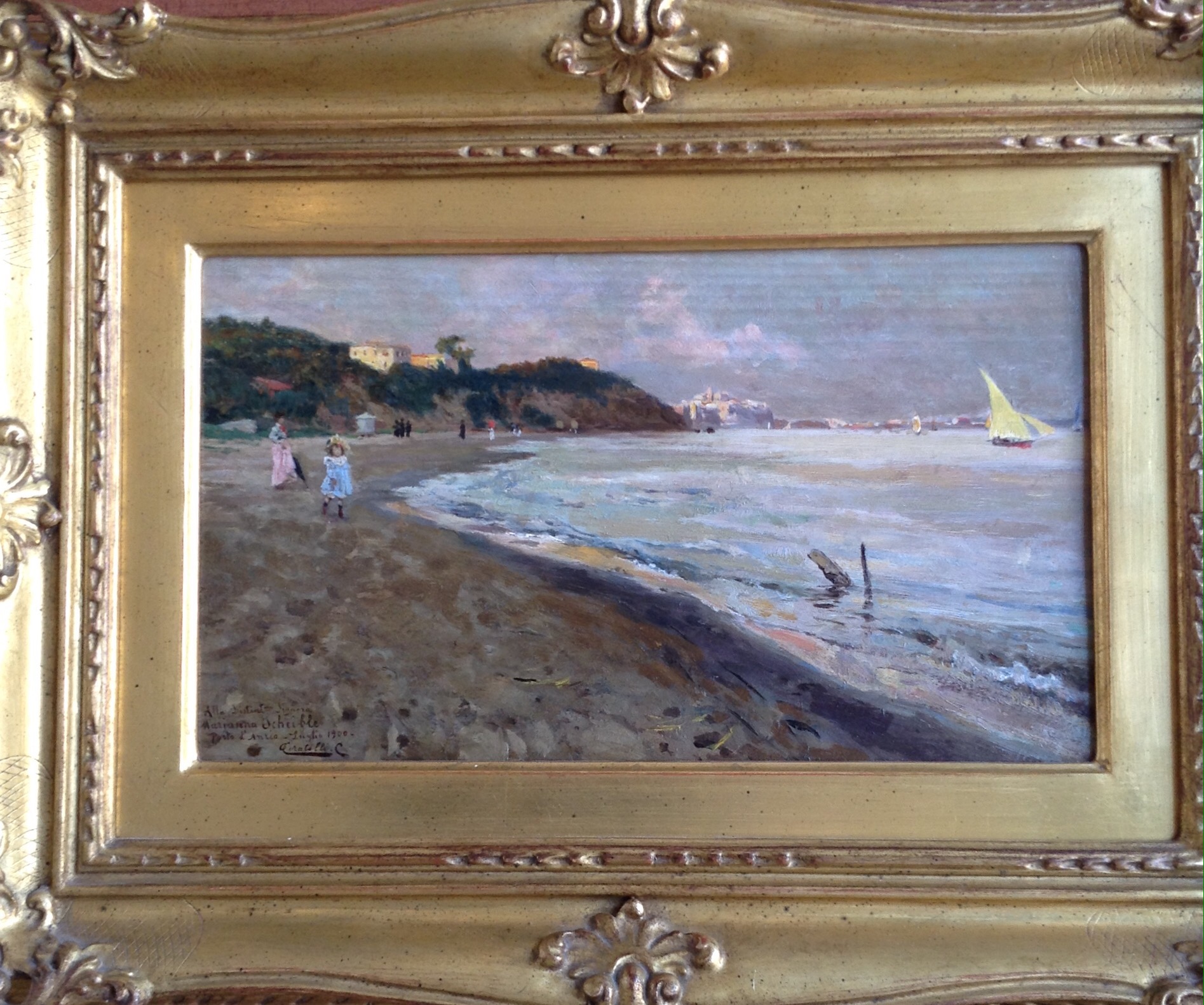 Spiaggia con figure, scorcio di Porto Anzio, fine e delicata tavoletta del pittore Cesare Tiratelli( Roma, 1864-1933), firmato,datato e dedicato ad personam.