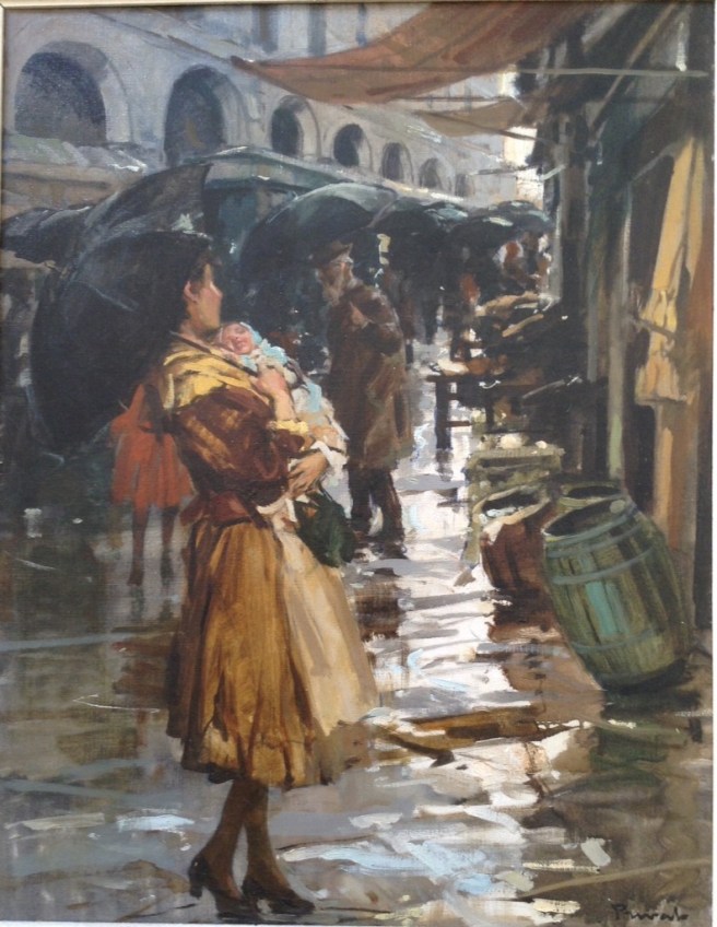 Mamma con bambino sotto la pioggia a Venezia, luminoso e dolce dipinto ad olio su tela del maestro veneziano Cosimo Privato( Venezia, 1899-1971)
