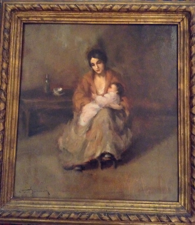 Mamma con bambino in un interno del pittore milanese Vittorio Gussoni( Milano, 1893- Sanremo, 1968)